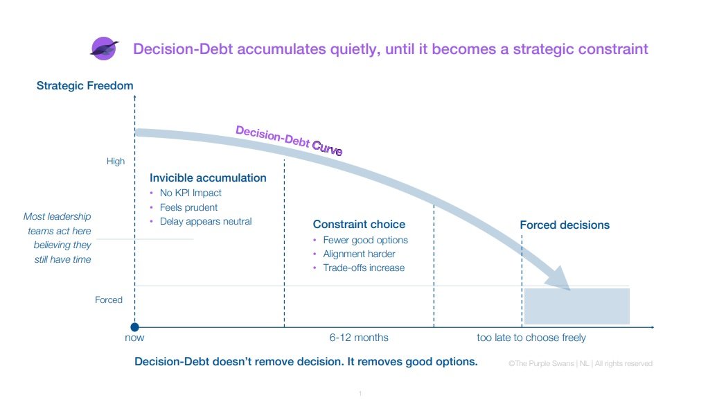 Most organizations don’t lose through one catastrophic decision. They lose strategic freedom through repeated postponement of high-stakes choices, especially under uncertainty. This creates Decision-Debt: an accumulated, unpriced liability that builds when leadership defers strategic decisions without explicit decision rights, decision criteria, and decision moment. Teams keep moving anyway, through local interpretations, exceptions, “temporary” assumptions, and parallel builds. The organization pays “interest” in rework, coordination drag, alignment erosion, compliance risk, and option decay. [1][2][3]