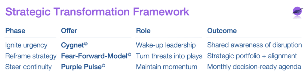 Purple Pulse is a lightweight monthly leadership cadence that keeps emerging risks, shifts and opportunities translated into a prioritized, decision-ready agenda. It helps leadership teams and boards stay alert without becoming overwhelmed, and responsive without becoming reactive.