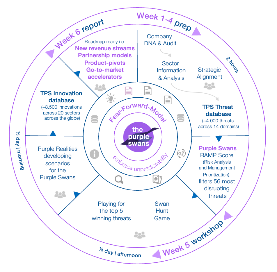 Fear-Forward Growth is a deliberate inversion of the traditional mindset. Instead of treating disruption as a threat to be minimized, it treats it as the raw material of strategic invention. The process begins with a gamified exploration of potential disruptions, called “Purple Swans”, that sit outside conventional planning horizons. It then moves into the creation of “Purple Realities”, immersive narratives of extreme but plausible futures. Finally, the new insights, quantified by TPS’s proprietary Innovation database, are ready to be woven into bold roadmaps that activate new strategies, investments, and innovations.